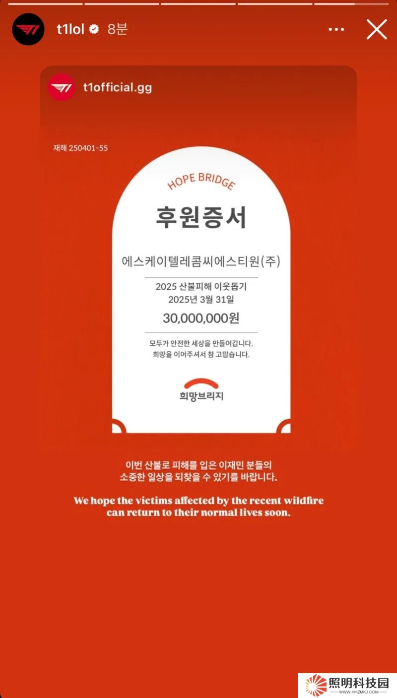 韓國東南部發(fā)生嚴重山火,T1捐款3000萬韓元,原內(nèi)容翻譯如下:希望因本次山火受災(zāi)的災(zāi)民們盡快恢復(fù)日常生活。
