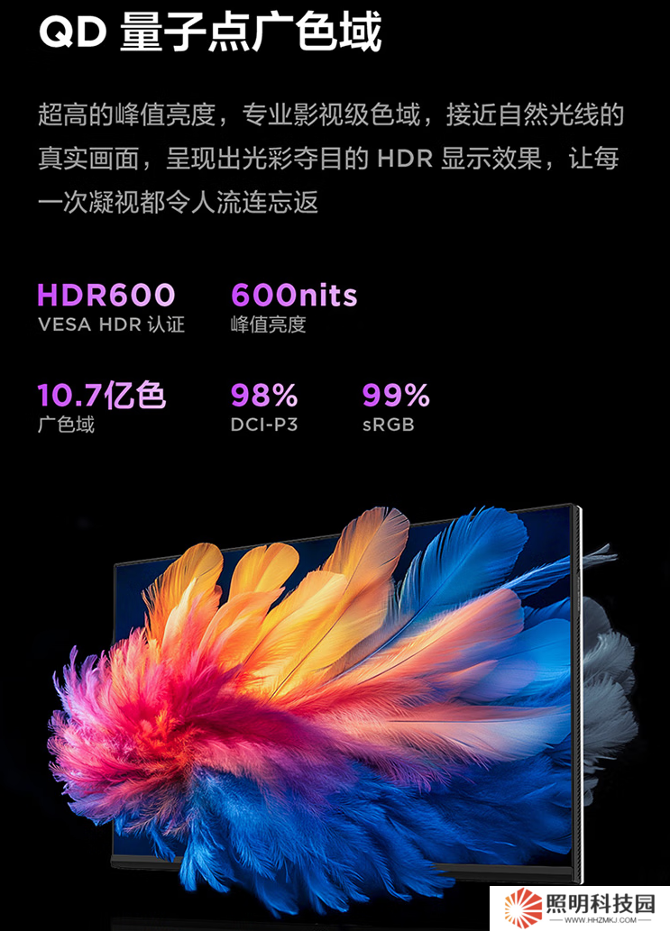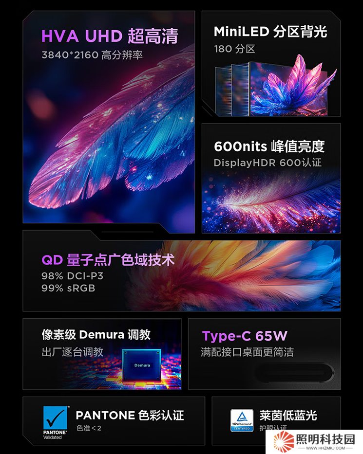 據(jù)介紹,雷鳥 27 英寸顯示器“U6”搭載華星 HVA 面板,分辨率 3840×2160、擁有 180 個 Mini LED 分區(qū)背光。顯示器峰值亮度 600nits,覆蓋 98% DCI-P3、99% sRGB 色域。