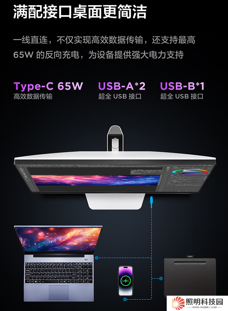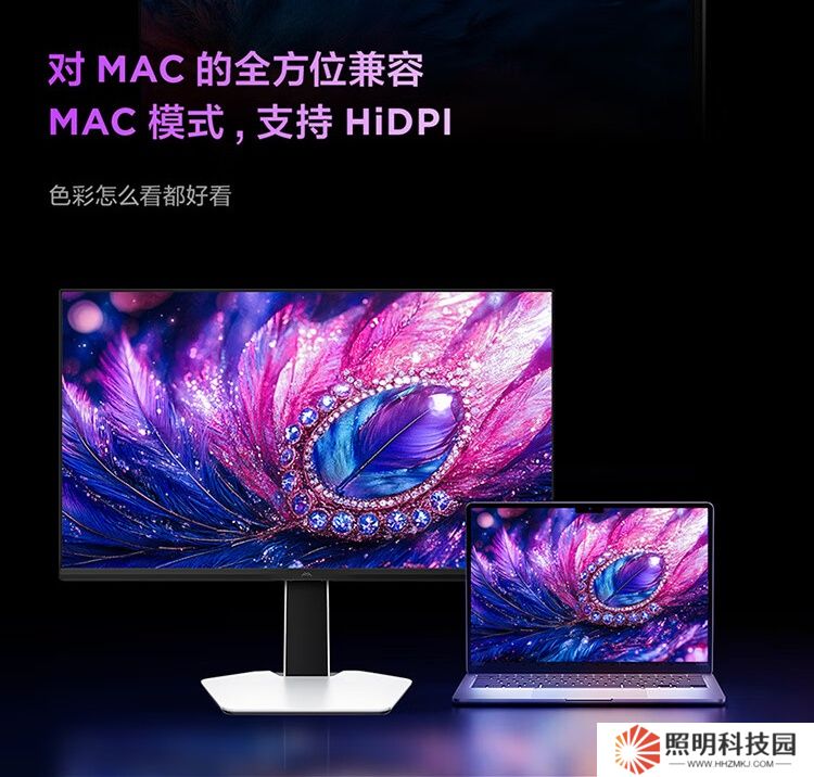 該款顯示器宣稱對 Mac 全方位兼容,內(nèi)置 Mac 模式,支持 HiDPI。顯示器還支持 Type-C 接口一線直連,提供 65W 反向充電。