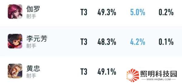 以上則是伽羅,李元芳和黃忠目前的巔峰賽數據,雖然勝率都有0.5%左右的提升,但出場率依舊低迷,還是排在墊底的位置。