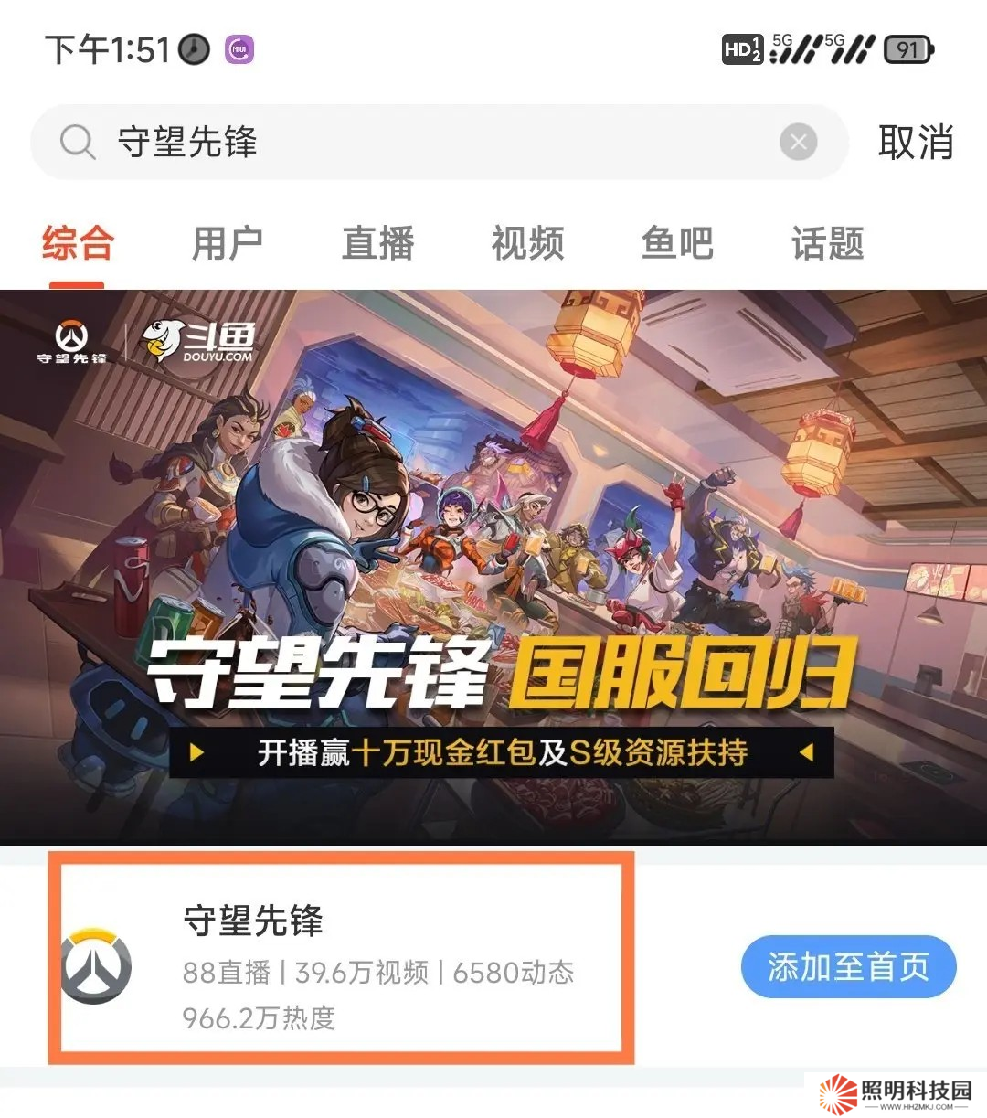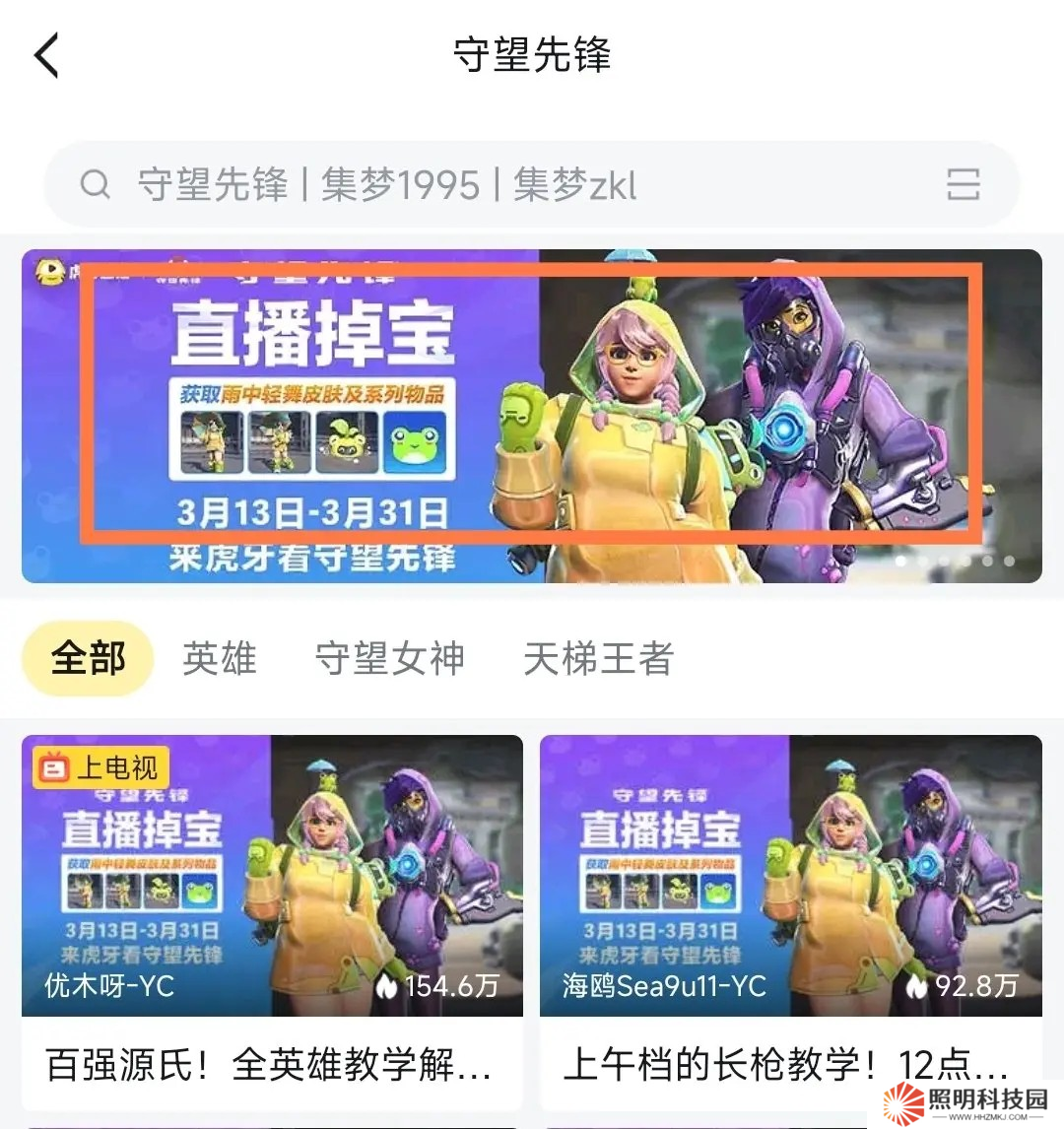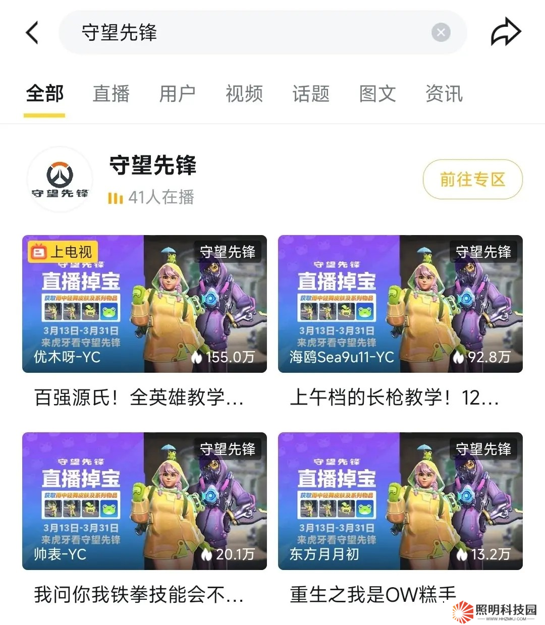 >打開虎牙App,搜索“守望先鋒”,進入專區。